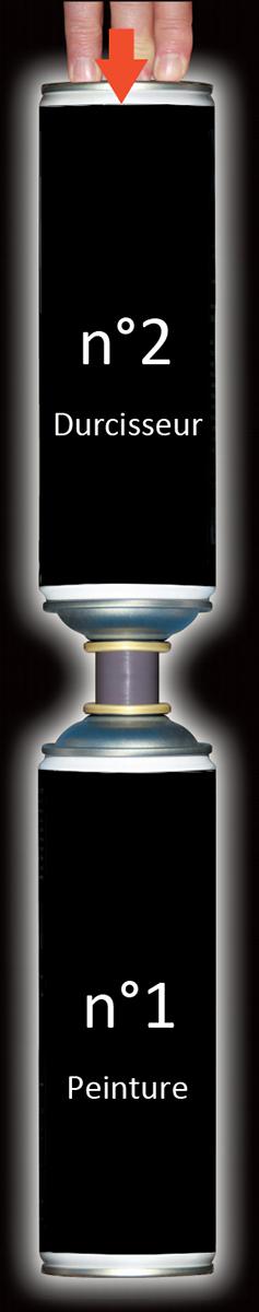 Le principe consiste à transférer le contenu de l'aérosol contenant le durcisseur (n°2) dans l'aérosol de peinture (n°1).